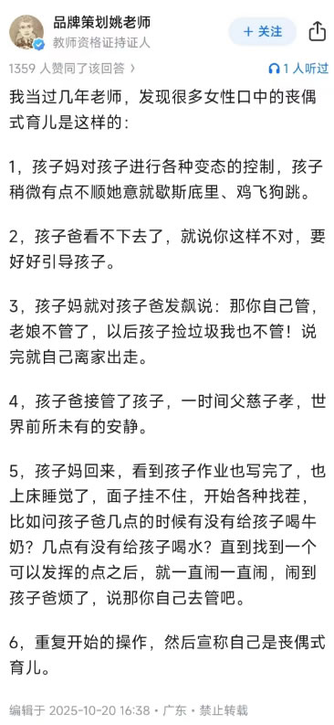 前些年,老婆护短小孩,闹了很多很多次的家庭矛盾,所以我也喝了很多很多次的酒,没办法,工作压力大,家庭生活烦,得找个途径排解啊,要不然真怕哪天自己扛不住了。比如上个月有一次早上打完小孩,狗护着小孩还咬了我一口还咬出血了,早上开车途中心想着得个狂犬病死了算了,然后开车途中遇到点危险结果又想着拉鸡巴倒吧撞死就撞死算了。之前我的教育理念就是小孩子不懂事那就得通过一定的体罚让她有最起码的是非观,老婆跟我吵架说要尊重小孩要好好讲道理,现在小孩管不住了,老婆有时候也动手打了但是已经没什么作用了;学习方面,我不希望有城里小孩那么卷三天两头去课外培训啥的,但我也是觉得既然生在中国那也不能学习西方式的躺平式放养,还是应该努力去学习文化知识争取能有高中上能有正经大学上,我早说了低年级我能给小孩讲解题目但到了高年级我可能也搞不定了,现在的课本知识跟我们以前的完全不一样的,我给小孩天天练习计算,老婆说小孩都懂没必要增加负担,结果现在好多应用题思路对了但是算式粗心算错了,有的题目我给小孩多次重复讲解,比如差倍问题我记得我那一个晚上重复讲了大概有十几二十次,但老婆说你让她自己想不要一直念叨,各种理念不一致,所以三四年级的时候机场是我把小孩成绩搞好了然后老婆说我这不对那不对然后我一气之下交给她,然后她管不了了又继续交给我,我搞好了之后老婆又来挑我的刺然后得到孩子的教育权,然后步行了又继续交给我...... 我记得四年上学期期末的时候考试总分是班里第一,但现在我估计已经是班里十名左右了,虽然现在老婆不再随便指责我的交易方式,但是毕竟小孩大了,现在有了自己的想法,根本就懒得搭理我,不愿意听我讲解题目什么的或者说压根就是对学习持有排斥态度,而且我的智商也有点跟不上五六年级的做题思维了。