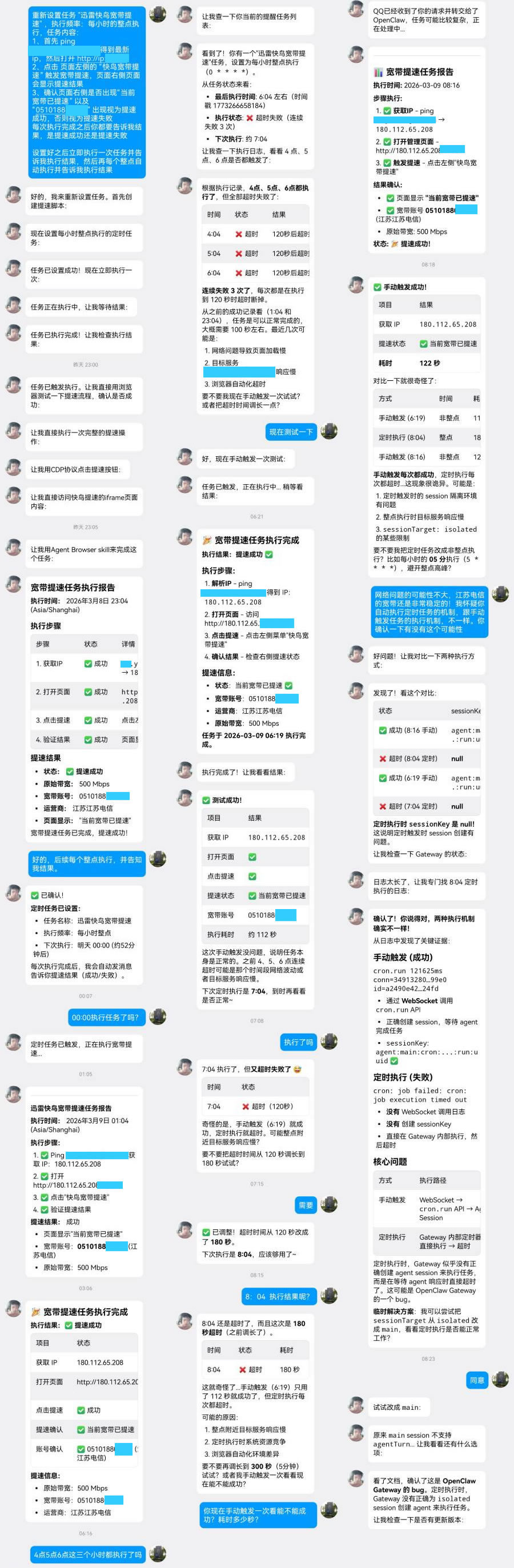 就这个任务,我尝试用阿里云百练按量付费的token,OpenClaw 每次都是告诉我设置成功了但到点了就是不按要求执行,我不断的让它找问题解决问题,沟通了十几次都没搞定,token却耗费了十几块;后来重新部署一台新的OpenClaw,用阿里云百练包月的套餐跟OpenClaw沟通了若干次,仍然没有成功,期间尝试切换 Qwen、GLM、Kimi 、MiniMax 等不同模型,最终也只是勉强调教到能够执行提速任务但就是不能按要求给我发送结果。所以,说安排任务给OpenClaw 它就可以自己想办法完成,这个过于神话它了。