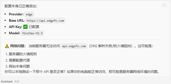4、我在使用过程中还发现OpenClaw经常忘记自己的任务是什么,叫它做件事,它可能要安装一些依赖可能要找一些skill可能要检索一些在线资料等等,然后突然没反应了似乎忘记还有任务在身了;更糟糕的是,我发现有时候它还会很粗心的弄错资料,比如前天我给它一个增加大模型API接口的任务,然后它一顿操作猛如虎便告诉我搞定了,然而我测试了下发现根本就没用,于是又让它自己排查问题,结果它告诉我服务器无法访问,可能是DNS解析失败或防火墙阻挡: