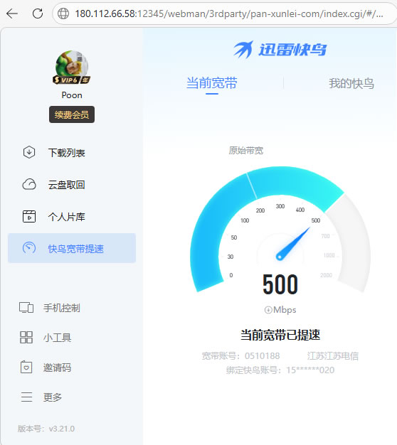 安装成功显示v3.21.0,这正是我想要的版本!我可以使用OpenClaw设置定时任务,让它每个小时都访问一次迅雷快鸟提速的URL,以最大程度的确保提速正常(签约网速200M、提速到500M)