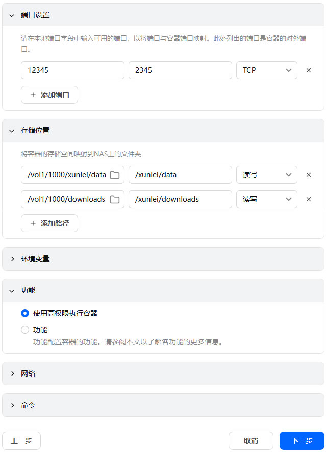 1、迅雷快鸟宽带提速的问题,试了很多办法找了不同的AI大模型帮协助分析,结果都未能如愿提取到直接可用的URL也无法提取到合适可用的cookies或token,不管是飞牛OS还是群晖NAS的应用商店,所提供的新版迅雷都改成了嵌入式应用、不再提供独立端口,花费了大量时间都没搞定,今晚突然想到能否使用旧版本迅雷,于是在上面所述的URL页面找到了截图,截图的左下方就当时的那个版本号 v3.21.0,于是到飞牛的Docker拉取镜像 cnk3x/xunlei,未找到v3.21.0 于是选择了v3.20.2,安装过程需要配置的参数参考如下: