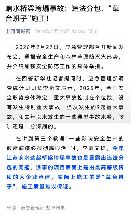 月港大桥在通榆河上,该处河宽约80米,并不是很大的工程,承建方是国家的中铁十二局,但是却发生了5人死亡这样的重大事故,并且如大家所猜测,最终的调查结果主要是分包商的问题、中铁十二局只是次要责任。